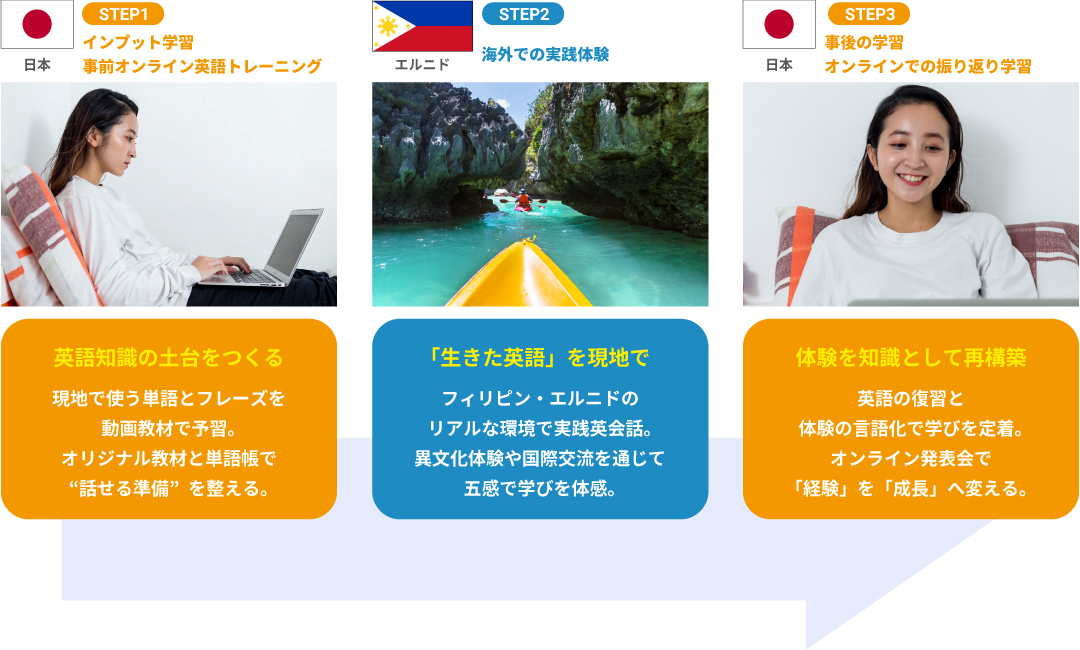 お申し込み後、事前準備としてオンライン動画講義、オンライン英会話研修が始まります。渡航前に、現地で使用する「単語」と「基本フレーズ」を学びます。さらに、オンライン英会話を通じて、発話トレーニングを行い、実際の会話に備えます。